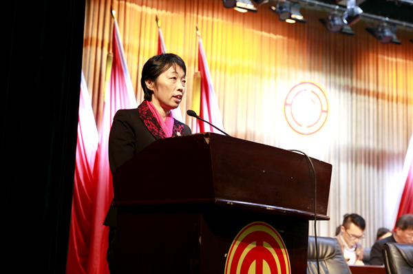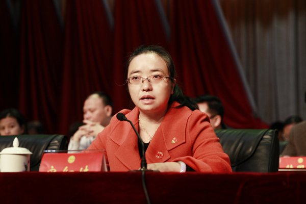 梅美华代表区总工会向大会作题为《不忘初心 接力前行 团结全区广大职工群众为建设“实力、活力、魅力、和谐”浔阳而努力奋斗》的报告